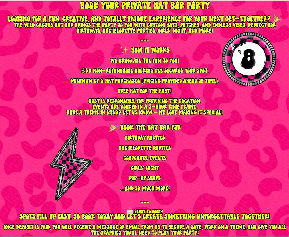 The Wild Cactus Hat Bar brings the party to YOU with custom hats, patches, and endless vibes. Perfect for birthdays, bachelorette parties, girls’ night, and more!
